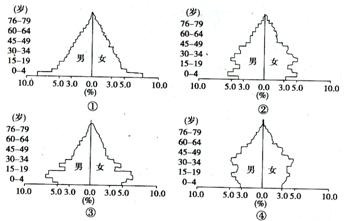 11.若该经线为110°E,图6四幅图中表示HF所在国近60年来四个不同时期的人口年龄金字塔图,按时间先后排序正确的是 ( )