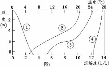 某研究性学习小组调查了一个温带湖泊的情况,并将冬季和夏季不同水深的氧气含量和温度绘成曲线图,如图7所示。在一定温度和压强下,气体在一定量溶剂中溶解的最高量称为气体的溶解度。据此完成12-13题。