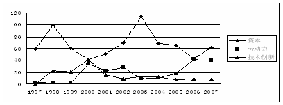 18.江苏1997-2007年资本、劳动力、技术创新等因素对经济增长贡献率的变化特征,叙述错误的是 ( )