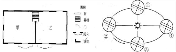 28、下面左图是某房地产公司在抚顺市开发的一梯两户式商品房平面图,右图为地球公转示意图,分析回答下列问题。(8分)