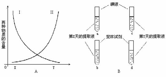 取成熟到第X天和第Y天的等量香蕉果肉,分别加等量的蒸馏水制成提取液,然后在a、b试管中各加5mL第X天的提取液,在c、d试管中各加5mL第Y天的提取液。如图B
