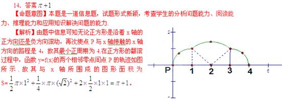 解析:不难想象,从某一个顶点(比如A)落在x轴上的时候开始计算,到下一次A点落在x轴上,这个过程中四个顶点依次落在了x轴上,而每两个顶点间距离为正方形的边长1,因此该函数的周期为4。下面考察P点的运动轨迹,不妨考察正方形向右滚动,P点从x轴上开始运动的时候,首先是围绕A点运动