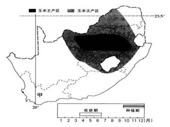 下图为某国玉米生产区分布.种植与收获玉米的时间图表。该国是所在大洲最大的玉米产区,也是全球主要的玉米出口国。读图回答3-4题。