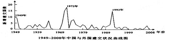 (2)材料三显示,新中国成立以来,形成了1949年、1972年和1992年三次与外国建交的高峰。据此并结合所学,分别指出1949年和1972年新中国外交的特点及其原因。 (8分)