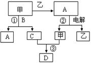 (10分) A、B、C、D是由前18号元素组成的四种常见化合物,D为红棕色气体,甲、乙是两种单质,这些单质和化合物之间存在如下反应关系: