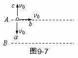 如图9-7所示,真空中存在范围足够大的匀强电场,A、B为该匀强电场的两个等势面。现有三个完全相同的带等量正电荷的小球a、b、c,从等势面A上的某点同时以相同速率v0向不同方向开始运动,其中a的初速度方向垂直指向等势面B;b的初速度方向平行于等势面;c的初速度方向与a相反。经过一段时间,三个小球先后通过等势面B,已知三个小球始终在该匀强电场中运动,不计重力,则下列判断中正确的是( A )