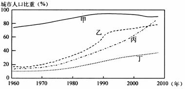 下图为“四国城市人口比重变化示意图”。读图完成10-11题。