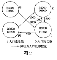 图2为甲、乙、丙、丁“四个城镇某年人口变化图”。读图完成4-5题。