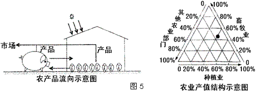 我国北方某地区春夏生产粮食,秋冬利用塑料大棚生产蔬菜,同时开办了大型养猪场。读图5完成13-14题。