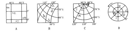 4.下图的四个区域中甲地在乙地西北,丙地在丁地东南的是( )