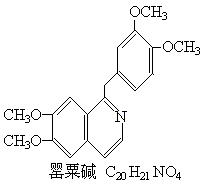 鸦片 鸦片罂粟果实中的乳状汁液制成的一种毒品。罂粟果汁中含有一种有毒的物质是罂粟碱,它的分子式是C20H21NO4,这一种异喹啉生物碱,它的结构如图所示。它是从罂粟中分离出来的一种生物碱。罂粟碱为无色针状或棱状结晶,熔点147-148℃,易溶于苯、丙酮、热乙醇、冰醋酸,稍溶于乙醚、氯仿,不溶于水,溶于浓硫酸;加热到110℃变为玖瑰红色,至200℃则变为紫色,它与多种无机酸和有机酸结合生成结晶盐。