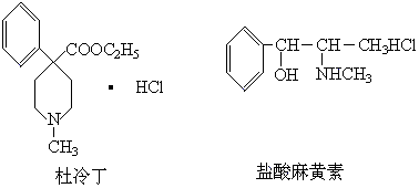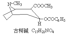 从古柯树叶提取的一种药物,又叫古柯碱。可卡因是一种莨菪烷型生物碱,分子式为C17H21NO4,结构简式如图 。古柯碱是无色无臭的单斜形晶体,味先苦而后麻,熔点98℃,几乎不溶于水,可溶于一般的有机溶剂,但其盐酸盐易溶于水。古柯碱为酯类,用酸或碱水解时,生成苯甲酸、甲醇等。