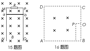 15.(16分)如图所示,足够长的光滑平行金属导轨MN、PQ竖直放置,磁感应强度B=0.50T的匀强磁场垂直穿过导轨平面,导轨的上端M与P间连接阻值为R=0.50Ω的电阻,导轨宽度L=0.40m。金属棒ab紧贴在导轨上,现使金属棒ab由静止开始下滑,通过传感器记录金属棒ab下滑的距离h与时间t的关系如下表所示。(金属棒ab和导轨电阻不计,g=10m/s2)