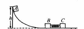 (14分)如图所示,一轻质弹簧的一端固定在滑块B上,另一端与滑块C接触但未连接,该整体静止放在光滑水面上.现有一滑块A从光滑曲面上距桌面高为h处由静止开始滑下,与滑块B发生碰撞并粘在一起压缩弹簧推动滑块C向前运动.经一段时间,滑块c脱离弹簧,继续在水平面上匀速运动.已知mA=m ,mB=2m,mC=3m,求: