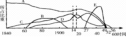 10.下列图中五条曲线反映了1840-1956年我国五种经济形态,即自然经济、民族资本、外国资本、洋务资本与官僚资本的发展变化情况,其中曲线E代表官僚资本,请问ABCD哪一曲线代表民族资本发展轨迹