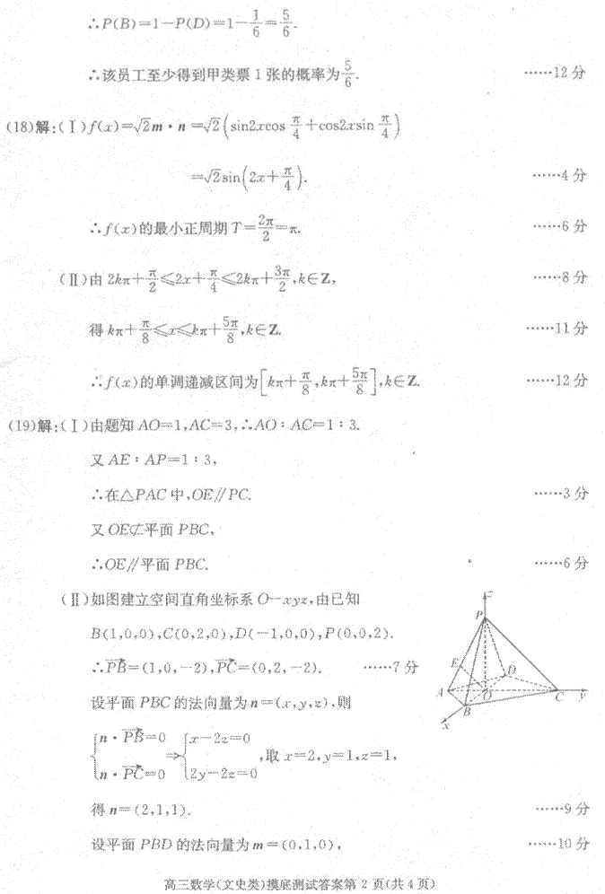 19、 (本小题满分12分) 如图,在四边形ABCD中,AC⊥BD,垂足为O,PO⊥平面ABCD,AO=BO=DO=1,CO=PO=2,E是线段PA上的点,AE∶AP=1∶3. (1)求证:OE∥平面PBC; (2)求二面角D-PB-C的大小.