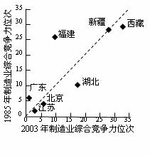 39. 下图 反映了1985年和2003年我国部分省(区、市)制造业综合竞争力在全国位次的变化。从中可知新疆、江苏、福建、湖北四省(区)的制造业综合竞争力位次变化是