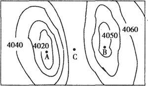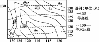 [例4] 读下图,回答1~2题。(在地形图上,将某一含水层中承压水位相等的各点连接起来,所形成的曲线称等水压线)