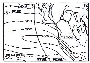 (2)图中B处等降水量线向北凸出的原因是