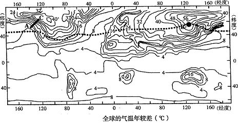 (2)图中A到C处气温年较差变化很快,原因可能有哪些?