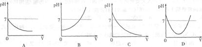 10.(2009潍坊)在甲溶液中滴加几滴石蕊试液,溶液呈蓝色;然后再滴加乙溶液,当滴至甲、乙两物质正好完全反应时,溶液呈紫色;再继续滴加乙溶液时,溶液呈红色。在上述过程中,表示溶液的pH(纵坐标)与滴加乙溶液的体积V(横坐标)之间的关系的正确图像是( C )
