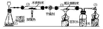 16、如图所示。B中放有的固体物质可能是CaCO3或Zn粒或两者的混合物;D中放有的黑色粉末可能是木炭粉或CuO或两者的混合物。向A中加入盐酸后,点燃酒清灯。根据实验现象回答下列各问: