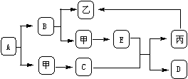 (8分) (2009雅安)下图是初中化学中常见物质间的转化关系,其中甲、乙、丙为单质;A、B、C、D、E为化合物,且A与B的组成元素相同,D与E的组成元素也相同。已知C、丙均为黑色粉末,C和E在高温条件下可生成丙和D,D能使澄清的石灰水变浑浊。其余反应条件、部分反应物和生成物均已略去。试推断: