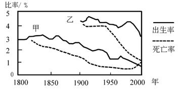 A.19世纪中期甲国人口急剧减少 B.20世纪初期乙国人口增长最快