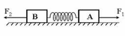 23.(16分)如图所示,在水平地面上有A、B两个物体,质量分别为mA=3.0kg和mB=2.0kg,它们与地面间的动摩擦因数均为μ=0.10。在A、B之间有一原长l=15cm.劲度系数k=500N/m的轻质弹簧将它们连接。现A、B在两个方向相反的水平恒力F1、F2作用下一起匀加速运动,已知F1=20N,F2=10N,取g=10m/s2。求: