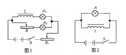 图2电路中,当S断开时,我们只看到A灯闪亮了一下后熄灭,那么S断开时图1电路中就没有自感电流?能否看到明显的自感现象,不仅仅取决于自感电动势的大小,还取决于电路的结构.在图2电路中,我们预先在电路设计时取线圈的阻值远小于灯A的阻值,使S断开前,并联电路中的电流IL>>IR ,S断开瞬间,虽然L中电流在减小,但这一电流全部流过A灯,仍比S断开前A灯的电流大得多,且延滞了一段时间,所以我们看到A灯闪亮一下后熄灭,对图1的电路,S断开瞬间也有自感电流,但它比断开前流过两灯的电流还小,就不会出现闪亮一下的现象.