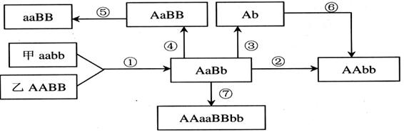 49、下图甲、乙表示水稻两个品种,A、a和B、b表示分别位于两对同源染色体上两对等位基因,①-⑦表示培育水稻新品种的过程,则下列说法错误的是 ( )