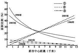 13.曲线①、②、③代表的土地利用类型符合一般城市三类用地时空变化特点的是