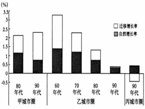 下图为三个城市圈20世纪不同年代人口增长示意图。读图回答15-16题。