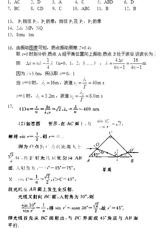 16.(10分)如图所示是一列横波上A、B两质点的振动图象,该波由A传向B,两质点沿波的传播方向上的距离Δx=4.0m,波长大于3.0m,求这列波的波速。