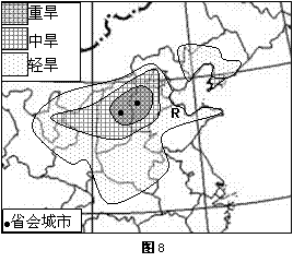 材料二:2009年2月我国北方地区干旱分布图(图8)