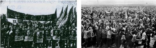 图一 1966年哈尔滨学生在广场游行 图二 1984年北大学生在国庆游行