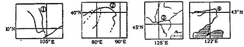 ①季风区与非季风区的分界线 ②内外流域的分界线