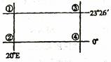 读下图,此时②点为正午,太阳高度角为90°,④点为昏线与赤道的交点。据此回答41-42题。