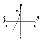 如图所示,a、b带等量异种电荷,a带正电,b带负电,MN是ab连线的中垂线,现有一个带电粒子从M点以一定的初速度v0射入电场,图中实线为开始时的一段轨迹,不考虑粒子的重力,则粒子在飞越该电场的过程中 ( )