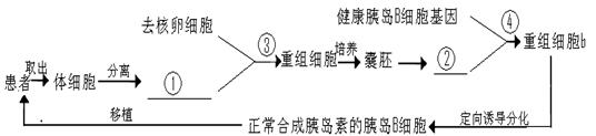 下图是利用现代生物工程技术治疗遗传性糖尿病(基因缺陷导致胰岛B细胞不能正常合成胰岛素)的过程设计图解,请据图回答: