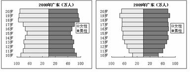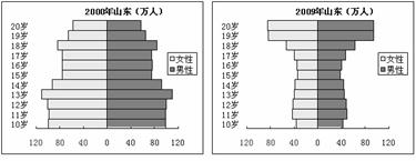 (福建省三明市市区三校2010届高三联考)18-20岁是高考适龄人口,从2000年至2008年,全国高考适龄人口持续增加,2009年是中国高考的转折年。图6为2000年和2009年10岁至20岁广东省和山东省的人口金字塔图。据图回答第5题。