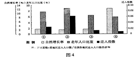 6、(贵州省遵义一中2010届高三上学期第一次联考)图4是我国第五次人口普查中四个省份的有关人口数据统计分析图。读图判断①、②、③、④所代表的省份依次是 ( )