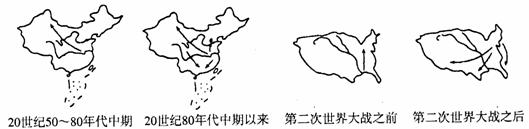 (福建省“四地六校”2010届高三上学期第二次联考)下图为“中国、美国(本土)两国不同时期的国内人口迁移示意图”。分析完成9-11题。