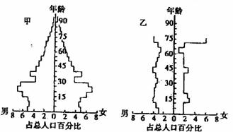 (1)甲、乙两国中,人口老龄化严重的是 国,理由是 。
