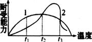 45.如图所示,曲线1和曲线2代表物种1和物种2的耐热范围,下列有关叙述正确的是( )