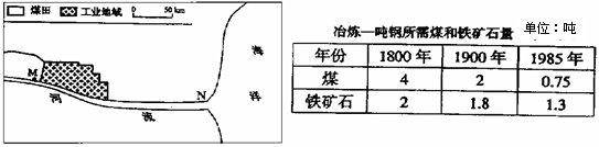 某钢铁厂于19世纪初建在M地;20世纪80年代将炼铁厂从M地迁至N地,炼钢厂仍留在M地,如左图所示。该钢铁厂所用的铁矿石一直依赖进口。图中河流可通航。结合下表,回答30-31题。