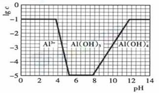 ②请在右图中,画出0.01mol·L-1NH4Al(SO4)2溶液中铝各形态的浓度的对数lgc随溶液pH变化的关系图。(作图提示:注意开始沉淀,沉淀完全,沉淀开始溶解,沉淀完全溶解时的pH)
