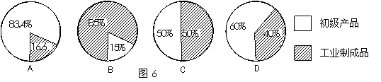 24.下面我国外贸出口商品构成图(图6)中,能表示90年代我国外贸出口商品构成的是
