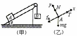 [例7跨过定滑轮的轻绳两端,分别系着物体A和物体B,物体A放在倾角为θ的斜面上(如图l-4-3(甲)所示),已知物体A的质量为m ,物体A与斜面的动摩擦因数为μ(μ<tanθ),滑轮的摩擦不计,要使物体A静止在斜面上,求物体B的质量的取值范围。