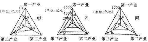 (山东省聊城实验中学2010届高三第三次月考)下图中甲、乙、丙代表我国三省区2005年的国民生产总值及其构成,a、b、c分别为三大产业的产值,完成23-24题。